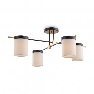 Примечание: Арматура из металла. Основной цвет — чёрный, декоративные элементы в цвете латунь. Тканевые бежевые абажуры-цилиндры украшены чёрными металлическими основаниями. Компактные размеры для невысоких потолков. Источник света — лампа с цоколем Е14..