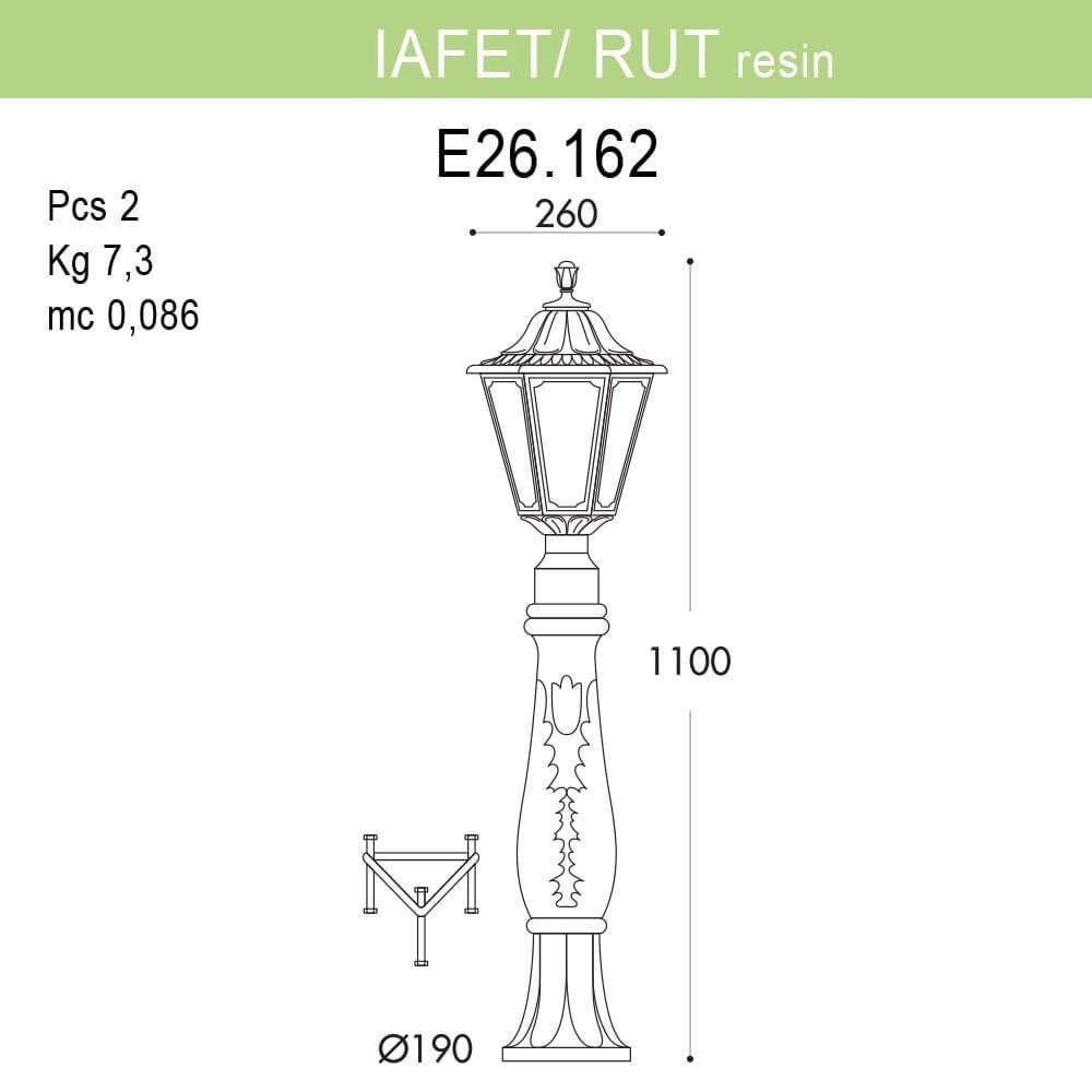 Садовый светильник-столбик FUMAGALLI серии RUT, модель RUT/IAFAET.R. Столбик освещения IAFAET.R и светильник RUT. Используются для архитектурного и ландшафтного освещения в стиле "классика". Место установки столбиков освещения - парковые дорожки, тротуары, газоны в парках и скверах, а так же ландшафтные и архитектурные объекты. Изготовлены в Италии, по уникальным технологиям "FUMAGALLI" из современного композитного полимера RESIN. Этот материал в 5 раз прочнее металла, не ржавеет, не окисляется, не выгорает на солнце, его не нужно красить. Все светильники пыле-влаго защищены по стандарту IP55 (Пылезащищенные, защита от водяных струй с любого направления). Рассеиватель выполнен из антивандального, не мутнеющего и не горючего PMMA (ПолиМетилМетаАкрилат). Срок службы светильника - не менее 20 лет. Температура использования от -60 до +90. В серии GLOBE 300 есть фонари в настенном (BISSO/ RUT, OFIR/ RUT, MIRRA/ RUT, PORPORA/ RUT) подвесном (SICHEM/ RUT) и наземном исполнении (MINILOT/ RUT, MIZAR.R/ RUT, IAFAET.R/ RUT, ALOE.R/ RUT, ARTU/ RUT, GIGI/ RUT, RICU/ RUT, RICU/ISSO/ RUT 2L, NEBO/ RUT, NEBO OFIR/ RUT 2L, NEBO OFIR/ RUT 3L) со столбами разной высоты, с разным количеством и конфигурацией голов. Консоли настенных фонарей и кронштейны светильников на столбах освщения могут устанавливаться вверх/вниз. Столбы выше 150 см имеют в основе мощную стальную трубу с двойной оцинковкой. При заказе требуется выбрать цвет корпуса, цвет плафона и тип патрона. По стилю и дизайну серия уличных светильников RUT похожа на светильники малого размера серии ANNA и на светильники большого размера серии NOEMI. По размеру RUT относится к средним светильникам как серия CEFA, SALEM и GLOBE 300.