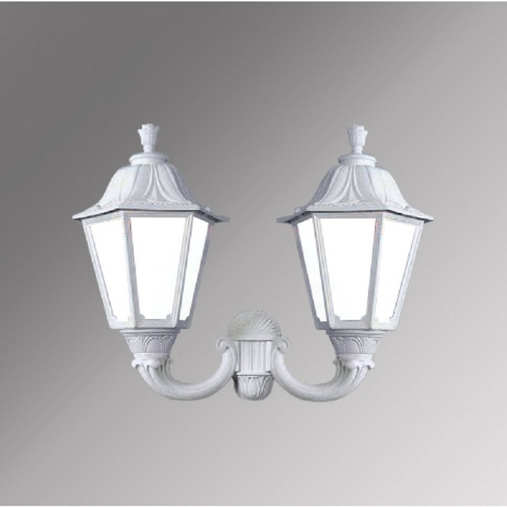 Светильник уличный настенный FUMAGALLI большого размера серии NOEMI, модель MIRRA/NOEMI. Двойной настенный уличный фонарь, большого размера с креплением на стену с помощью 2 консолей OFIR среднего размера. Устанавливается на стены домов, котеджей, заборов и других вертикальных поверхностей. Используется для освещения входных групп, общего уличного освещения, декоративной и фасадной подсветки. Изготовлены в Италии, по уникальным технологиям ",FUMATECH", из современного композитного полимера RESIN. Этот материал в 5 раз прочнее металла, не ржавеет, не окисляется, не выгорает на солнце, его не нужно красить. Все светильники пыле-влаго защищены по стандарту IP55 (Пылезащищенные, защита от водяных струй с любого направления). Рассеиватель выполнен из антивандального, не мутнеющего и не горючего PMMA (ПолиМетилМетаАкрилат). Срок службы светильника - не менее 20 лет. Температура использования от -60 до +90. В серии NOEMI есть садовые фонари в настенном (OFIR/NOEMI, MIRRA/NOEMI) подвесном (SICHEM/NOEMI) и наземном исполнении (IAFAET.R/NOEMI, ALOE.R/NOEMI, ARTU/NOEMI, GIGI/NOEMI, RICU/NOEMI, NEBO/OFIR/NOEMI 1L, NEBO/OFIR/ANNA 2L, TABOR/ADAM/NOEMI 3L) со столбами разной высоты, с разным количеством и конфигурацией голов. Консоли настенных фонарей и кронштейны светильников на столбах освещения могут устанавливаться в положение вверх и вниз. Столбы выше 150 см имеют в основе мощную стальную трубу с двойной оцинковкой. При заказе требуется выбрать цвет корпуса, цвет плафона и тип патрона (Е-27 или LED GX-53). Возможен светодиодный вариант. По стилю и дизайну серия уличных светильников NOEMI похожа на светильники среднего размера серии RUT и на светильники малого размера серии ANNA. По размеру относится к большим парковым светильникам как серия SIMON и GLOBE 400.