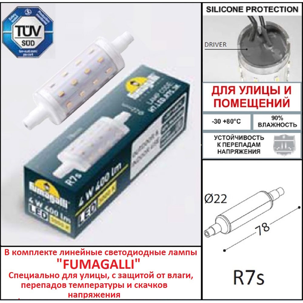 Светильники для подсветки лестниц встраиваемые, пр-ва FUMAGALLI серии NINA, модель NINA 150 - изготовлены в Италии. Устанавливаются в вертикальные поверхности: подпорные стенки, колонны, ступени лестниц, ниши, откосы и др., для подсветки пространства непосредственно перед ними. Светильники имеют прочный пыле-влагонепроницаемый корпус с степенью защиты IP 55, что позволяет их устанавливать в местах с возможной физической нагрузкой (например лестничные ступени). Маленький размер корпуса обеспечивает широкие возможности в применении подсветок серии NINA 150. Большой световой поток и минималистичный, вытянутый корпус, практически полное отсутствие ограничений по установке позволяет инсталировать встраиваемую подсветку в любой дизайнерский проект. В светильнике используется светодиодная линейная лампа FUMAGALLI прожекторного типа, с цоколем R7s, длиной 78 мм. Лампа имеет высшую категорию надежности, немецкий диплом-сертификат TYV, сертифицированна РосТестом. Маркировка OUTDOOR на лампе обозначает, что она предназначена для использования как в помещениях, так и на улице, в условиях больших перепадов температур, скачков напряжения и повышенной влажности. Корпус не проводит электричество, изготовлен из современного вандалостойкого не горючего полимера RESIN. Прочного, окрашенного в массе, не ржавеющего и не выгорающего на солнце, не проводящего электричество. Рассеиватель выполнен из антивандального, не мутнеющего и не горючего PMMA. Срок службы светильника - не менее 20 лет. Не требуется трансформатор. Напряжение питания - 220 В. Температура эксплуатации от -60 до +90. При заказе требуется выбрать цвет корпуса.