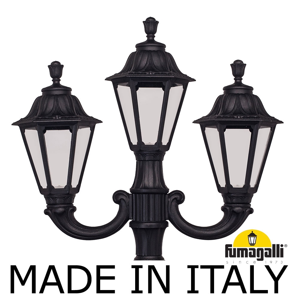 Парковый фонарь FUMAGALLI среднего размера серии RUT, модель NEBO OFIR/RUT 2L+1. Парковый фонарь с 2 светильниками на консолях OFIR + 1 венчающий, установленных на классическом столбе NEBO высотой 2,5 м (+высота фонарей на кронштейнах). Изготовлены в Италии, по уникальным технологиям ",FUMATECH", из современного композитного полимера RESIN. Этот материал в 5 раз прочнее металла, не ржавеет, не окисляется, не выгорает на солнце, его не нужно красить. Все светильники пыле-влаго защищены по стандарту IP55 (Пылезащищенные, защита от водяных струй с любого направления). Рассеиватель выполнен из антивандального, не мутнеющего и не горючего PMMA (ПолиМетилМетаАкрилат). Срок службы светильника - не менее 20 лет. Температура использования от -60 до +90. В серии RUT есть садовые фонари в настенном (OFIR/RUT, MIRRA/RUT) подвесном (SICHEM/RUT) и наземном исполнении (IAFAET.R/RUT, ALOE.R/RUT, ARTU/RUT, GIGI/RUT, RICU/RUT, NEBO/OFIR/RUT 1L, NEBO/OFIR/ANNA 2L, TABOR/ADAM/RUT 3L) со столбами разной высоты, с разным количеством и конфигурацией голов. Консоли настенных фонарей и кронштейны светильников на столбах освещения могут устанавливаться в положение вверх и вниз. Столбы выше 150 см имеют в основе мощную стальную трубу с двойной оцинковкой. При заказе требуется выбрать цвет корпуса, цвет плафона. По стилю и дизайну серия уличных светильников RUT похожа на светильники большого размера серии NOEMI и малого размера серии ANNA . По размеру относится к средним парковым светильникам как серия CEFA и GLOBE 300.