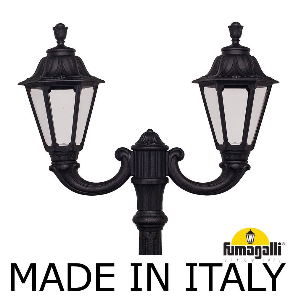 Парковый фонарь FUMAGALLI среднего размера серии RUT, модель NEBO OFIR/RUT 2L. Парковый фонарь с 2 светильниками, на консолях OFIR среднего размера, установленных на классическом столбе NEBO высотой 2,5 м (+высота фонарей на кронштейнах). Изготовлены в Италии, по уникальным технологиям ",FUMATECH", из современного композитного полимера RESIN. Этот материал в 5 раз прочнее металла, не ржавеет, не окисляется, не выгорает на солнце, его не нужно красить. Все светильники пыле-влаго защищены по стандарту IP55 (Пылезащищенные, защита от водяных струй с любого направления). Рассеиватель выполнен из антивандального, не мутнеющего и не горючего PMMA (ПолиМетилМетаАкрилат). Срок службы светильника - не менее 20 лет. Температура использования от -60 до +90. В серии RUT есть садовые фонари в настенном (OFIR/RUT, MIRRA/RUT) подвесном (SICHEM/RUT) и наземном исполнении (IAFAET.R/RUT, ALOE.R/RUT, ARTU/RUT, GIGI/RUT, RICU/RUT, NEBO/OFIR/RUT 1L, NEBO/OFIR/ANNA 2L, TABOR/ADAM/RUT 3L) со столбами разной высоты, с разным количеством и конфигурацией голов. Консоли настенных фонарей и кронштейны светильников на столбах освещения могут устанавливаться в положение вверх и вниз. Столбы выше 150 см имеют в основе мощную стальную трубу с двойной оцинковкой. При заказе требуется выбрать цвет корпуса, цвет плафона. По стилю и дизайну серия уличных светильников RUT похожа на светильники большого размера серии NOEMI и малого размера серии ANNA . По размеру относится к средним парковым светильникам как серия CEFA и GLOBE 300.