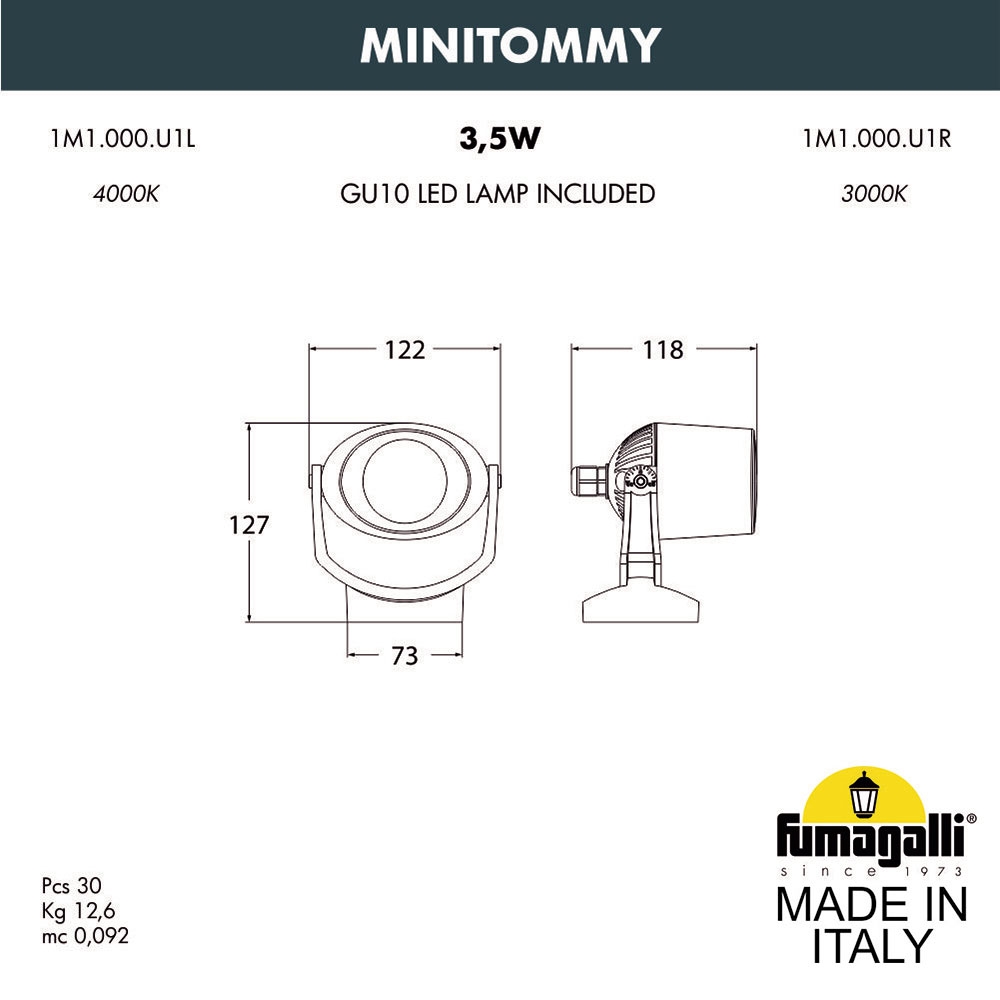 Фасадные светильники FUMAGALLI серии MINITOMMY - изготовлена в Италии. Из за малого размера используются для подсветки небольших архитектурных элементов фасадов зданий, кафе, ресторанов, витрин магазинов и бутиков и других объектов где требуется направленное "акцентное" освещение. Высокая степень защиты от пыли и влаги IP 66 позволяет использовать декоративные прожектора MINITOMMY не только в помещениях, но и на улице, в качестве ландшафтного светильника, без каких либо ограничений. Для крепления ландшафтного прожектора на газон с помощью "колышка" можно применить светильник из этой же серии MINITOMMY SPIKE. Корпус изготовлен из современного вандалостойкого полимера RESIN. Прочного, окрашенного в массе, не ржавеющего и не выгорающего на солнце, не проводящего электричество. Рассеиватель выполнен из антивандального, не мутнеющего и не горючего PMMA. Срок службы светильника - не менее 20 лет. Не требуется трансформатор. Напряжение питания - 220 В. Температура эксплуатации от -60 до +90. При заказе требуется выбрать цвет корпуса.
